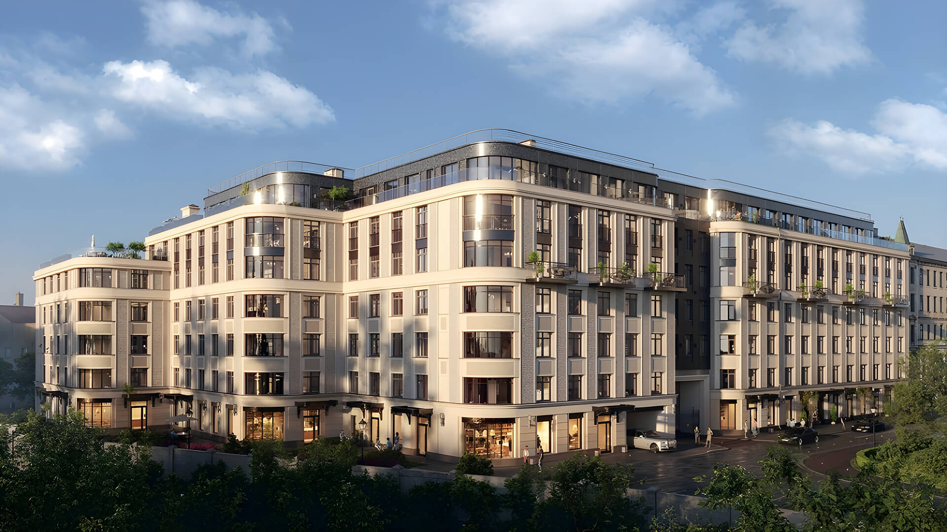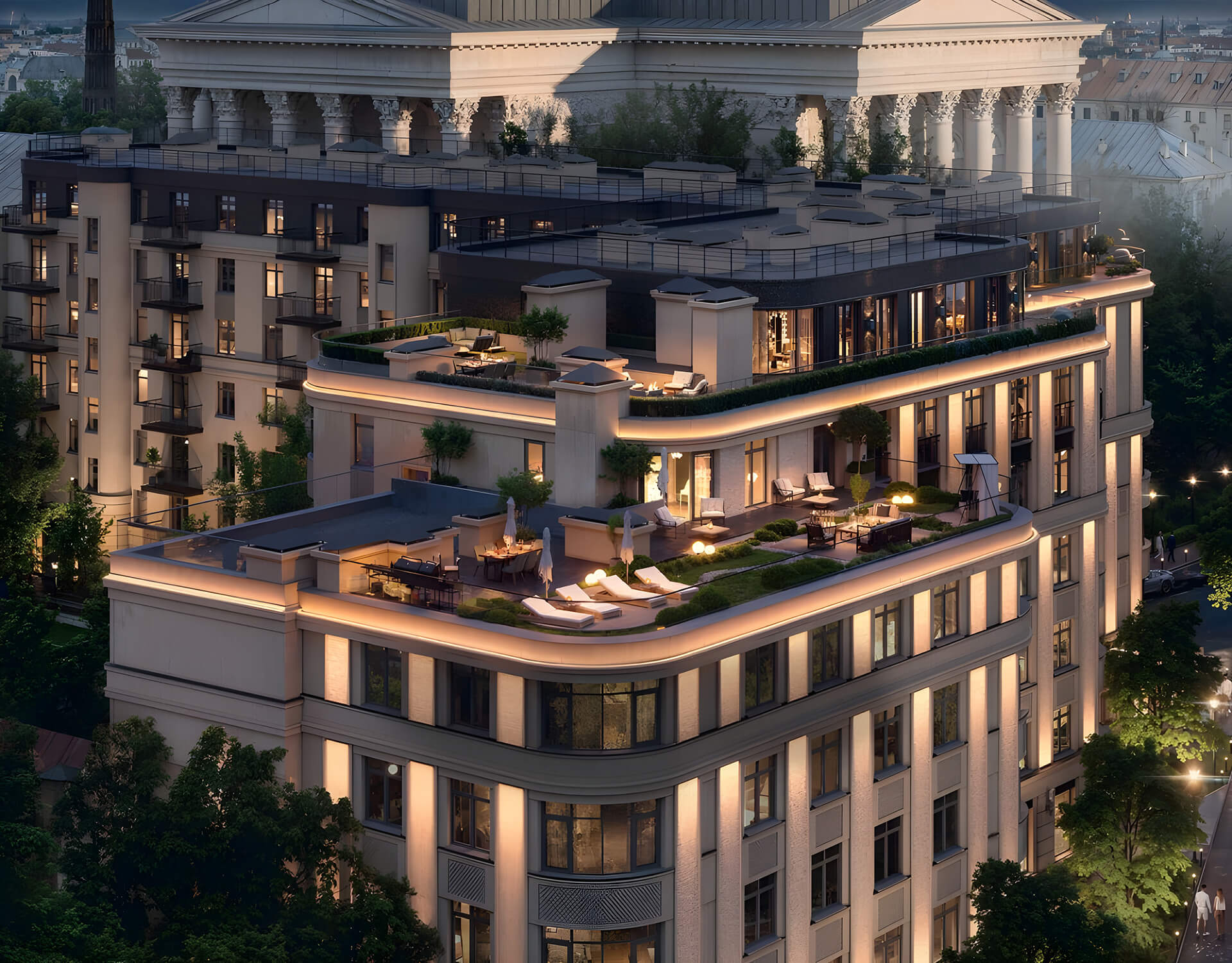 Внутренние общественные зоны разработаны с акцентом на величие и приватность. Центральный холл-лобби площадью почти 200 м² формирует первое впечатление о доме, демонстрируя стиль и премиальность архитектурной концепции. Использование высококачественных материалов, продуманная композиция света, простор и симметрия подчёркивают статус комплекса и создают атмосферу уединённого городского клуба, где каждый элемент визуально продолжает архитектурный язык фасадов.