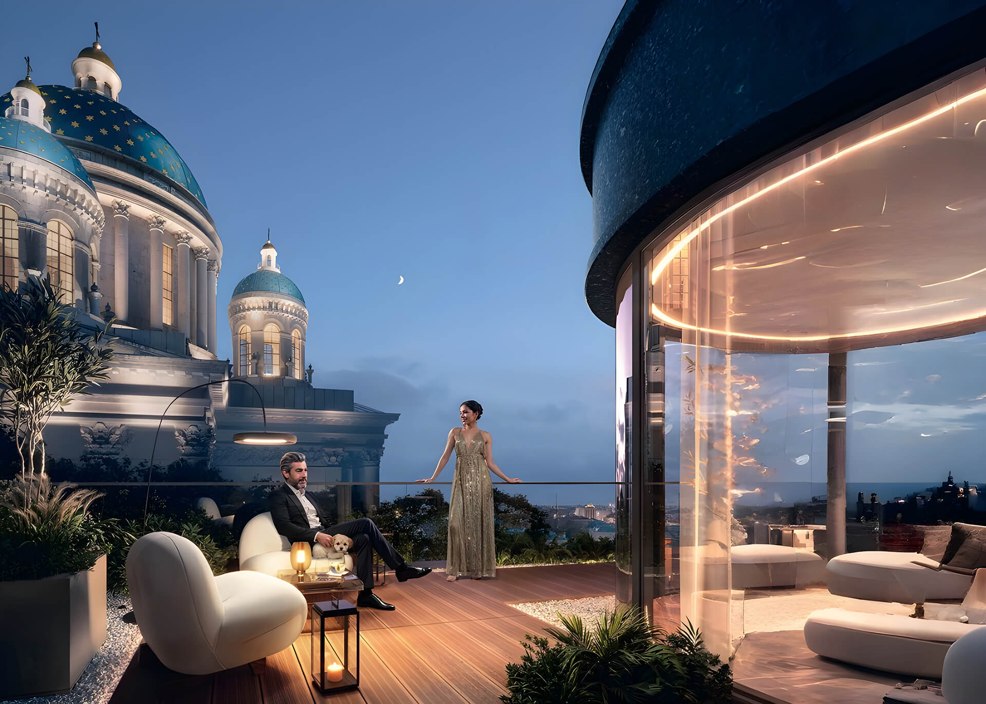 Особое внимание уделено видам и свету. Французские окна в пол, радиусные панорамы и витражные конструкции раскрывают виды на Троицкий собор, Фонтанку, Измайловский проспект и панорамы исторического центра. На верхних этажах расположено девять уникальных квартир с открытыми террасами и видовыми характеристиками, позволяющими наслаждаться городским горизонтом в любое время суток. Такие пространства создают атмосферу петербургского особняка в современном формате, где гармонично сочетаются приватность, эстетика и доступ к природному свету.