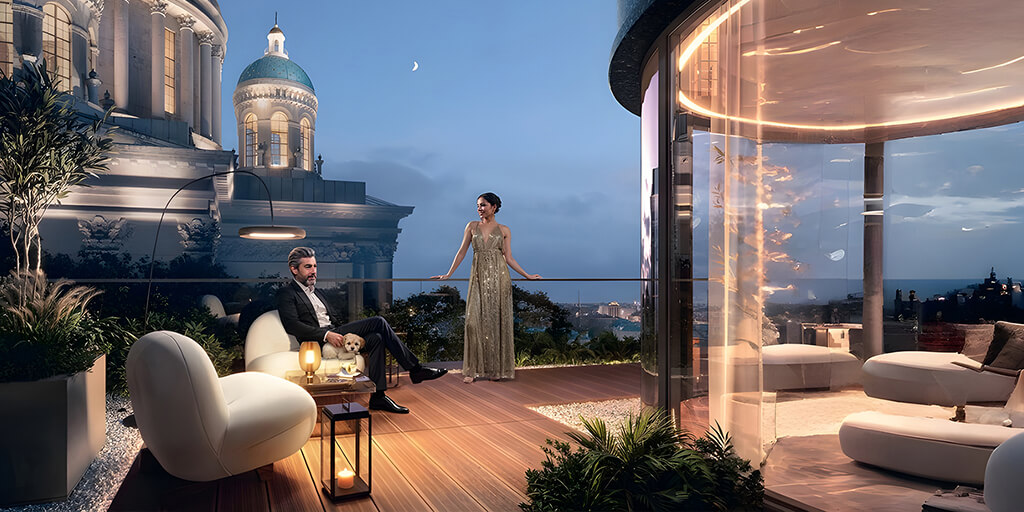Особое внимание уделено видам и свету. Французские окна в пол, радиусные панорамы и витражные конструкции раскрывают виды на Троицкий собор, Фонтанку, Измайловский проспект и панорамы исторического центра. На верхних этажах расположено девять уникальных квартир с открытыми террасами и видовыми характеристиками, позволяющими наслаждаться городским горизонтом в любое время суток. Такие пространства создают атмосферу петербургского особняка в современном формате, где гармонично сочетаются приватность, эстетика и доступ к природному свету.